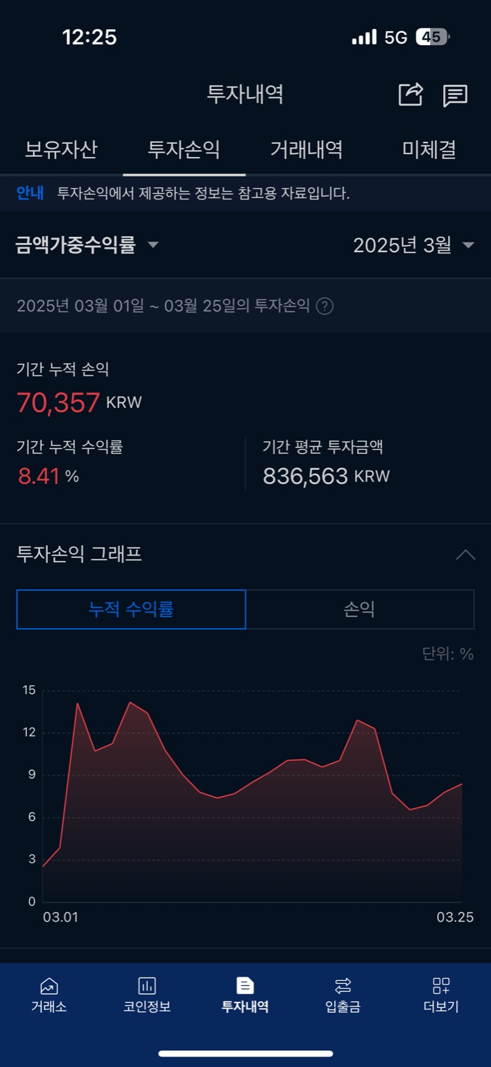 3월 1일부터 3월 25일까지의 수익은 총 70,357원, 수익률은 8.41%**를 기록했어요.